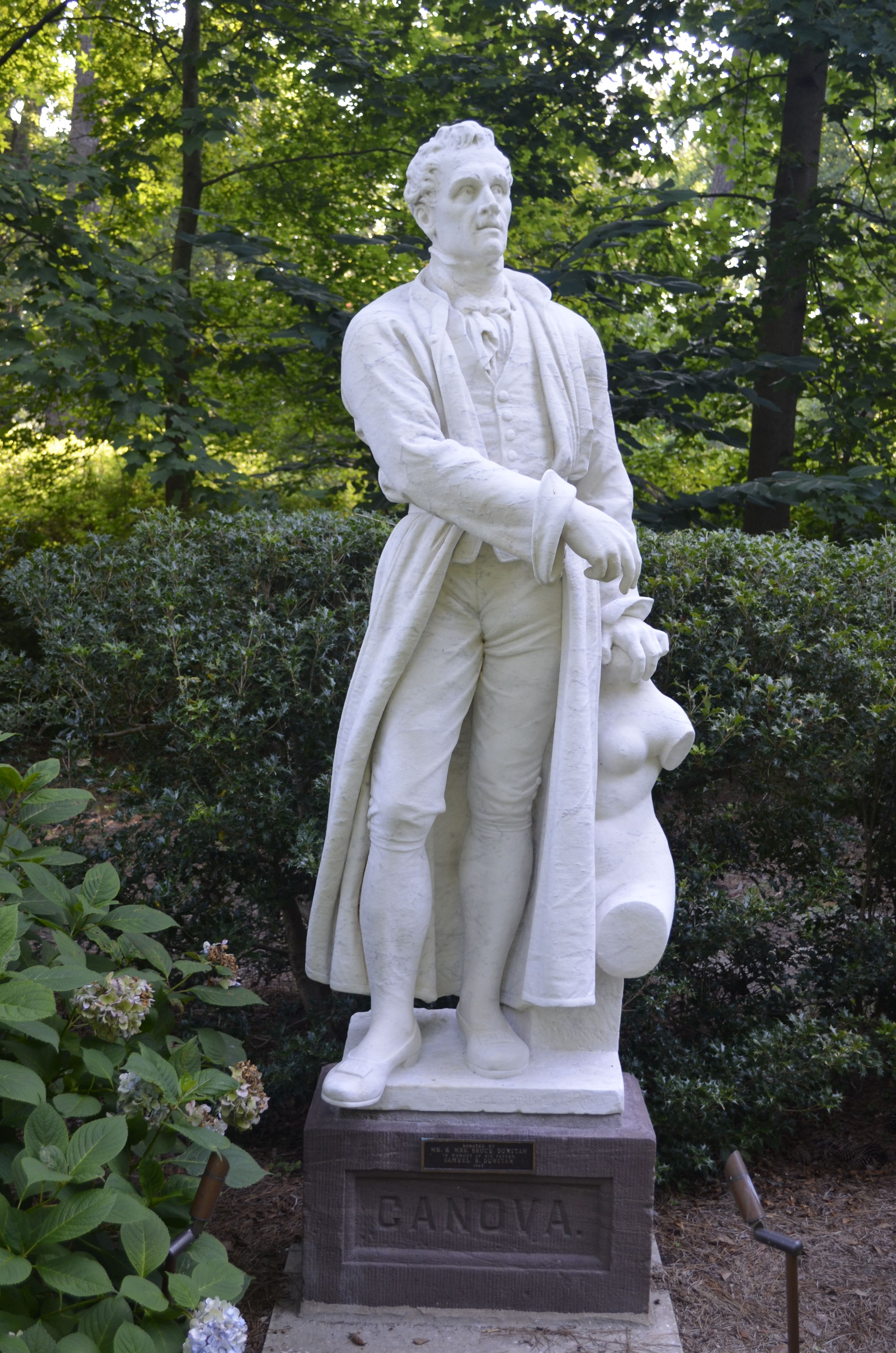 Statuary Vista features eleven, seven-foot tall statues carved from Cararra marble by Moses Ezekiel in Rome between 1879 and 1884 for William Wilson Corcoran, founder of the Corcoran Gallery of Art in Washington, D.C. These statues were originally designed to be set in second-story niches in the Corcoran Gallery. They depict notable painters and sculptors: Antonio Canova, Thomas Crawford, Leonardo da Vinci, Albrecht Durer, Michelangelo, Bartolome Murillo, Phidias, Raphael, Rembrandt, Peter Paul Rubens and Titian. The majority of the statues were donated to the Garden in 1962 and 1963 by Richmond residents Bruce Dunstan and Vincent Speranza.