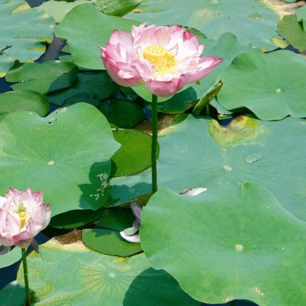 There are few flowers more attractive and eye-catching than that of sacred lotus (Nelumbo nucifera). The fragrant blossoms are shades of a delicate pink, surrounding a central pod. This edible and medicinal wetland plant is revered in Asian cultures for its ability to cleanly rise above the muck and mud with such beauty. After the blooms have gone, the attractive seed pods will remain and are prized by flower arrangers. You can enjoy these flowers up close and personal from the stone footbridge in our Japanese Garden.