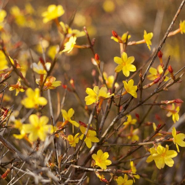 Each winter, this plant (Jasminum nudiflorum) graces us with bright yellow blooms on evergreen stems. It is a sprawling haystack of a shrub, not for gardeners who like neat and tidy control, but for those that like carefree abandon, no matter the time of year, it is perfect. Thrives in full sun with neglect.
